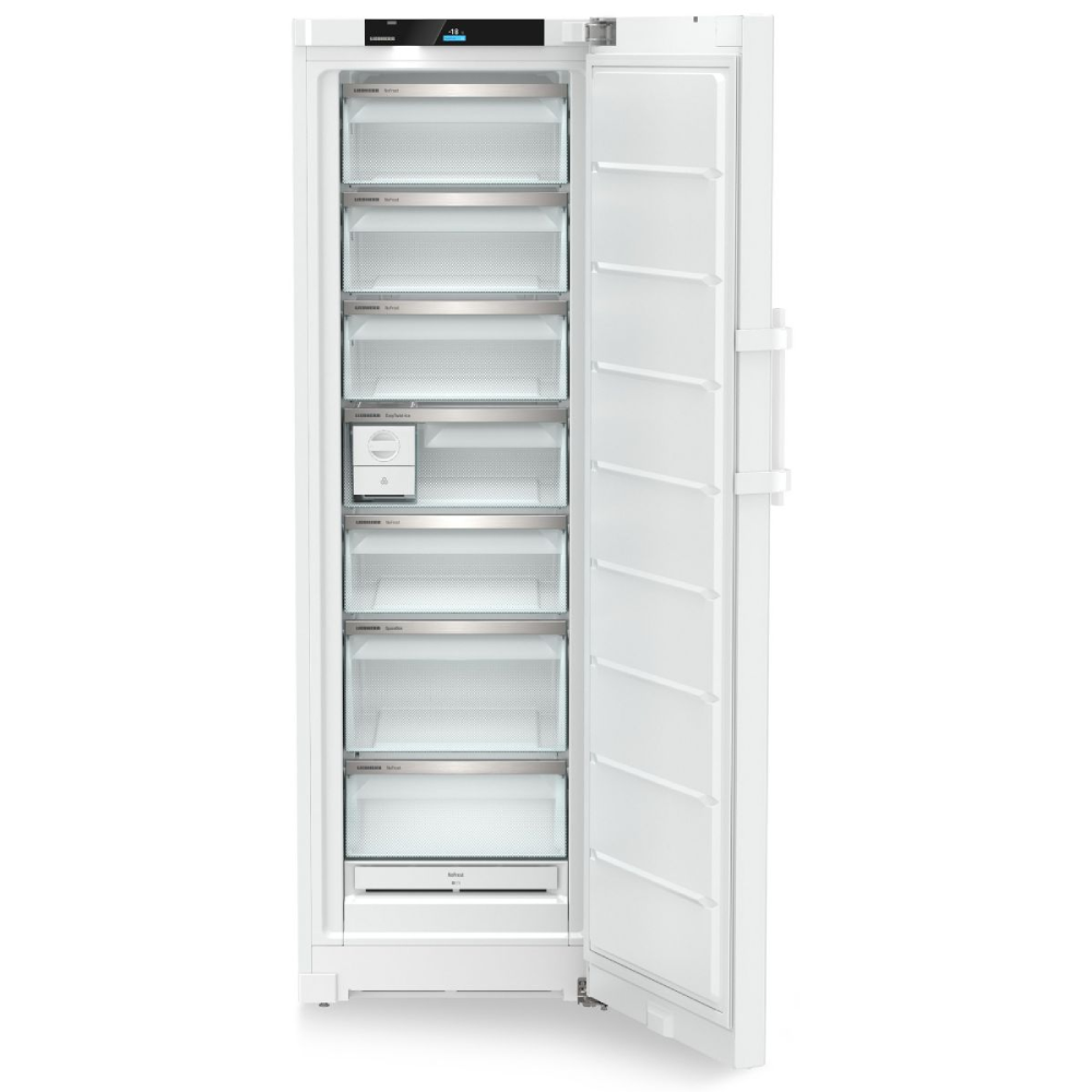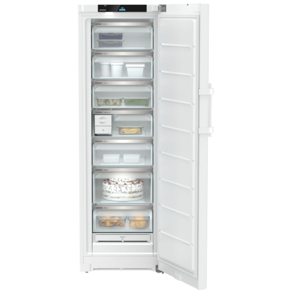 Congélateur armoire No-Frost BluPerformance connecté – Technologie BLUPerformance : pour un fonctionnement silencieux et un encombrement limité, l’intégralité du circuit froid est logé dans le socle. Les performances sont ainsi nettement améliorées avec un volume utile plus important et une consommation énergétique réduite – FrostProtect : fonctionnement performant même dans un local non chauffé non isolé, jusqu’à -15°C – 7 tiroirs – Tiroirs modulables VarioSpace- Easy Twist Ice : remplissez le réservoir d’eau, patientez 5 heures et démoulez 20 glaçons d’une simple rotation (Capacité de stockage jusqu’à 60 glaçons) – Fonction SuperFrost automatique – Mode Sabbat – Eclairage LED – Commandes électroniques internes (sur le top) – Ecran tactile TFT couleur – Voyant de fonctionnement discrètement intégré dans la porte : un témoin bleu indique que votre appareil fonctionne correctement. En cas de dysfonctionnement, l’affichage clignote en rouge et l’appareil émet un signal sonore – Alarmes visuelles et sonores – Connecté : simple et intuitive, l’application SmartDevice vous donne accès à votre appareil partout et tout le temps – Enchassable – Joint de porte amovible – Livré avec 2 accumulateurs de froid – Poignée à dépression.